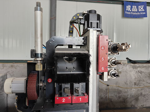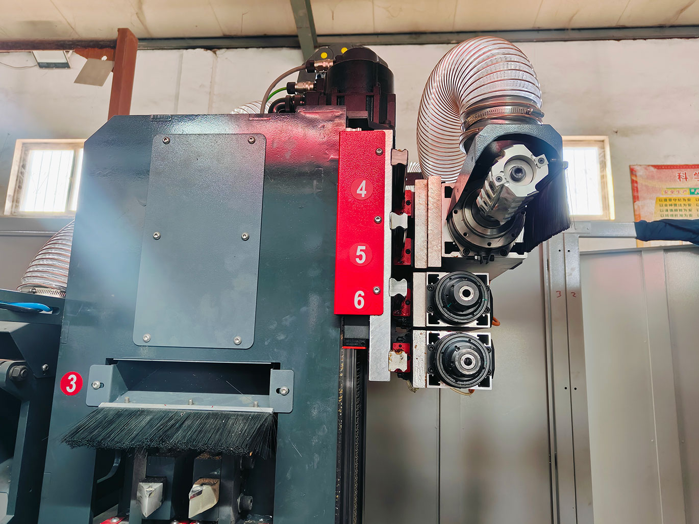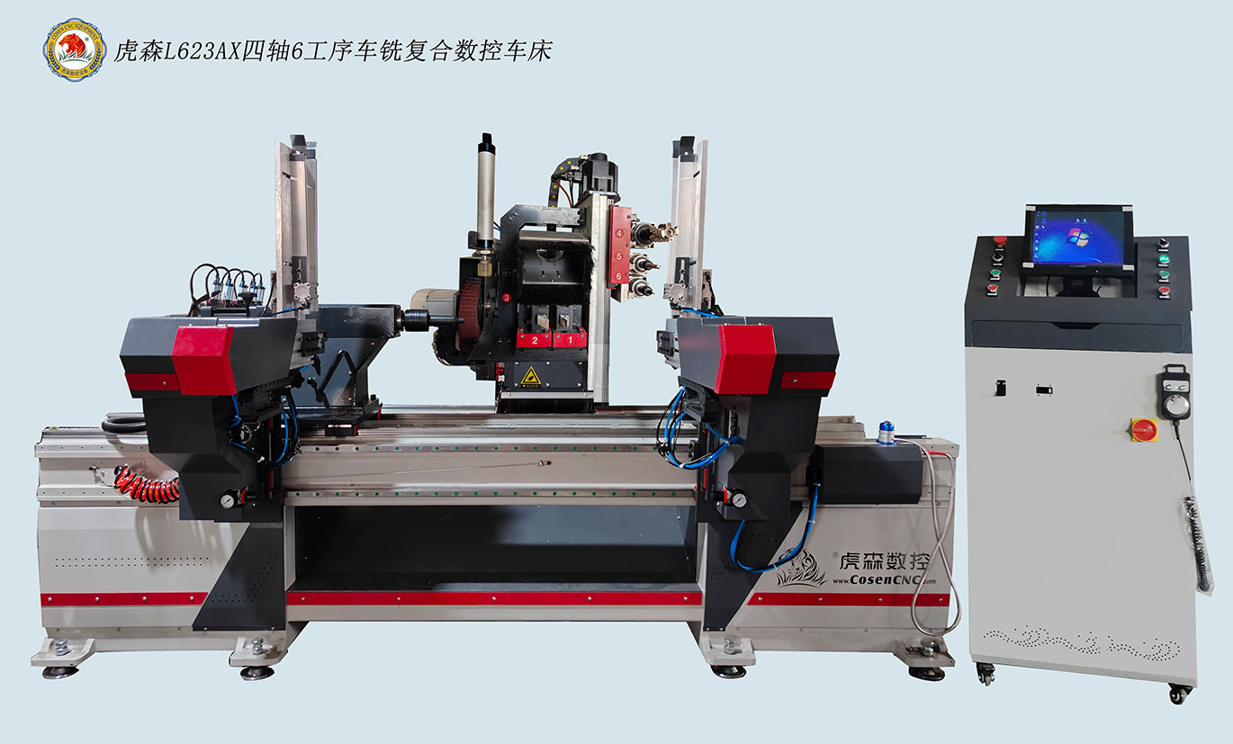 四軸6工序車銑複合加工中心,自動上料、自動打磨、雙刀車木、3個主軸電機(其中1個7.5KW光杆主軸電機帶動螺旋銑刀,另外2個小主軸電機可根據需求安裝不同功能刀具進行加工)。可車圓、銑型、拉槽、打孔、打磨等功能一次成型,適用於實木桌椅腿、沙發腿 、床腿、各種實木家具腿、樓梯木欄杆等旋轉木製品的加工。