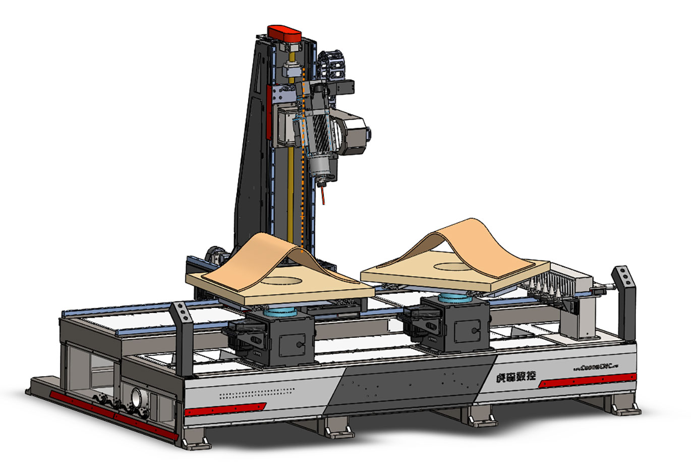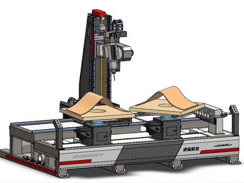 5軸鑽銑加工中心專業生產餐椅扶手,雙工位交替工作,生產效率高。