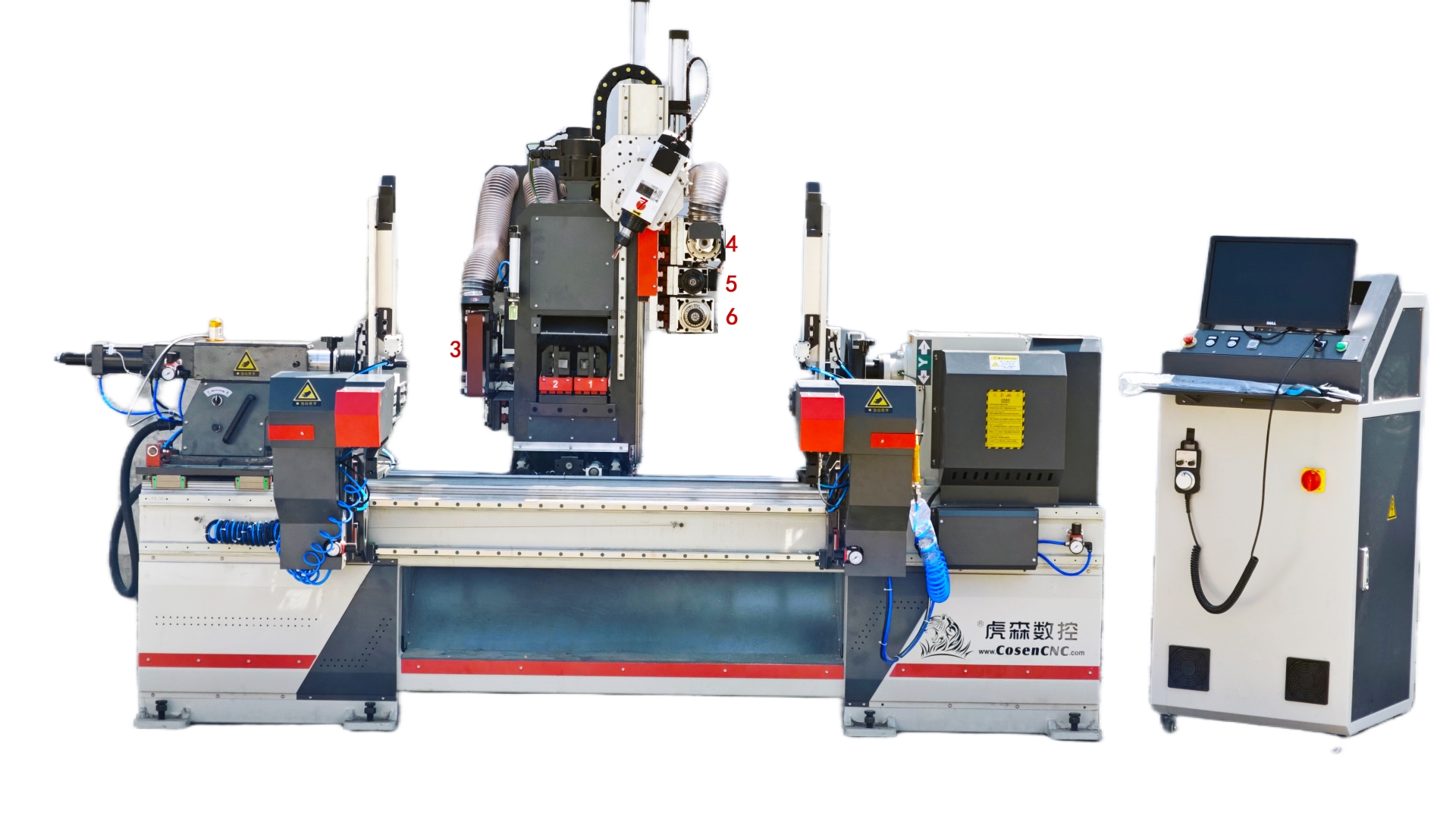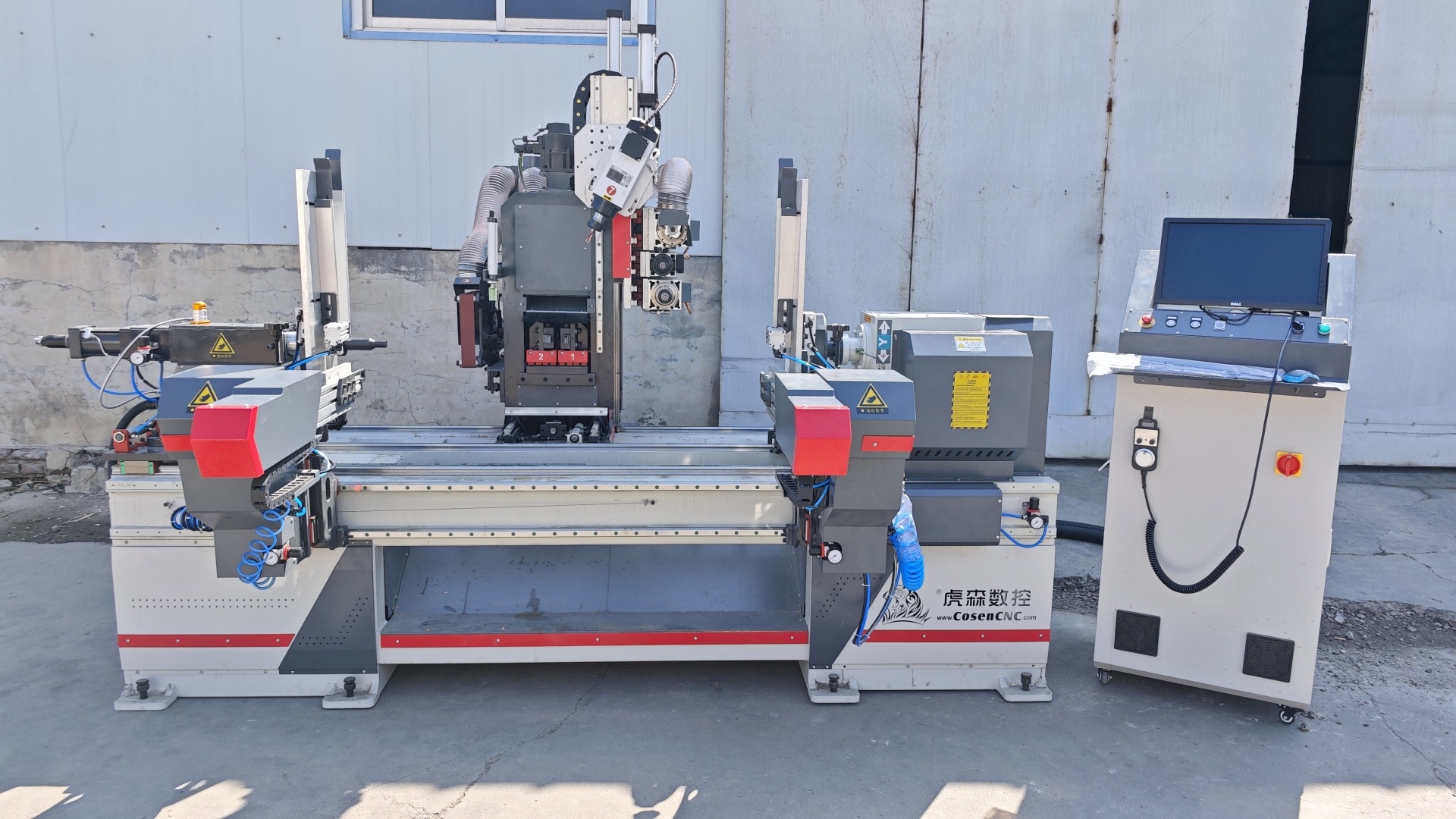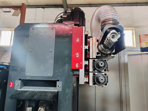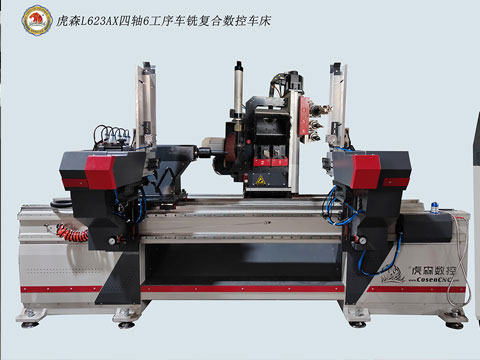 四軸6工序車銑複合加工中心,自動上料、自動打磨、雙刀車木、3個主軸電機(其中1個7.5KW光杆主軸電機帶動螺旋銑刀,另外2個小主軸電機可根據需求安裝不同功能刀具進行加工)。可車圓、銑型、拉槽、打孔、打磨等功能一次成型,適用於實木桌椅腿、沙發腿 、床腿、各種實木家具腿、樓梯木欄杆等旋轉木製品的加工。